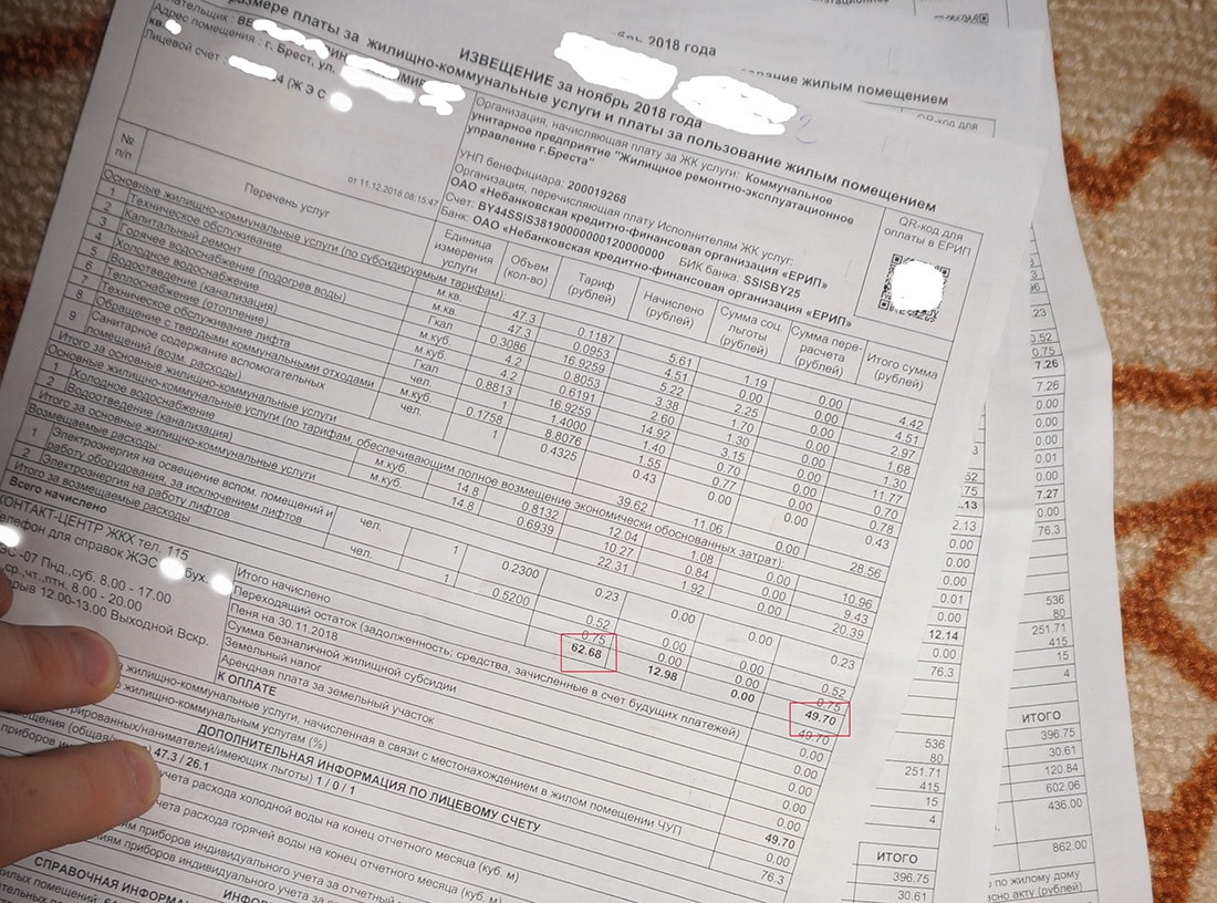 Белорусская жировка радует обилием строк — листик формата А4 испещрен мелкими буквами и цифрами: тут тебе и информация по всему жилому дому, и по своему лицевому счету, и что угодно еще. Теперь о конкретике: двухкомнатная квартира брестчанки имеет общую площадь 47 «квадратов», зарегистрирован в ней только один человек. За счастье пользоваться всеми коммунальными услугами в ноябре женщина отдала 50 рублей, или $23. При этом начислено за квартиру было больше — 62,68 рубля, или почти $29, и только некая льгота, которая положена женщине, скостила 13 рублей.
