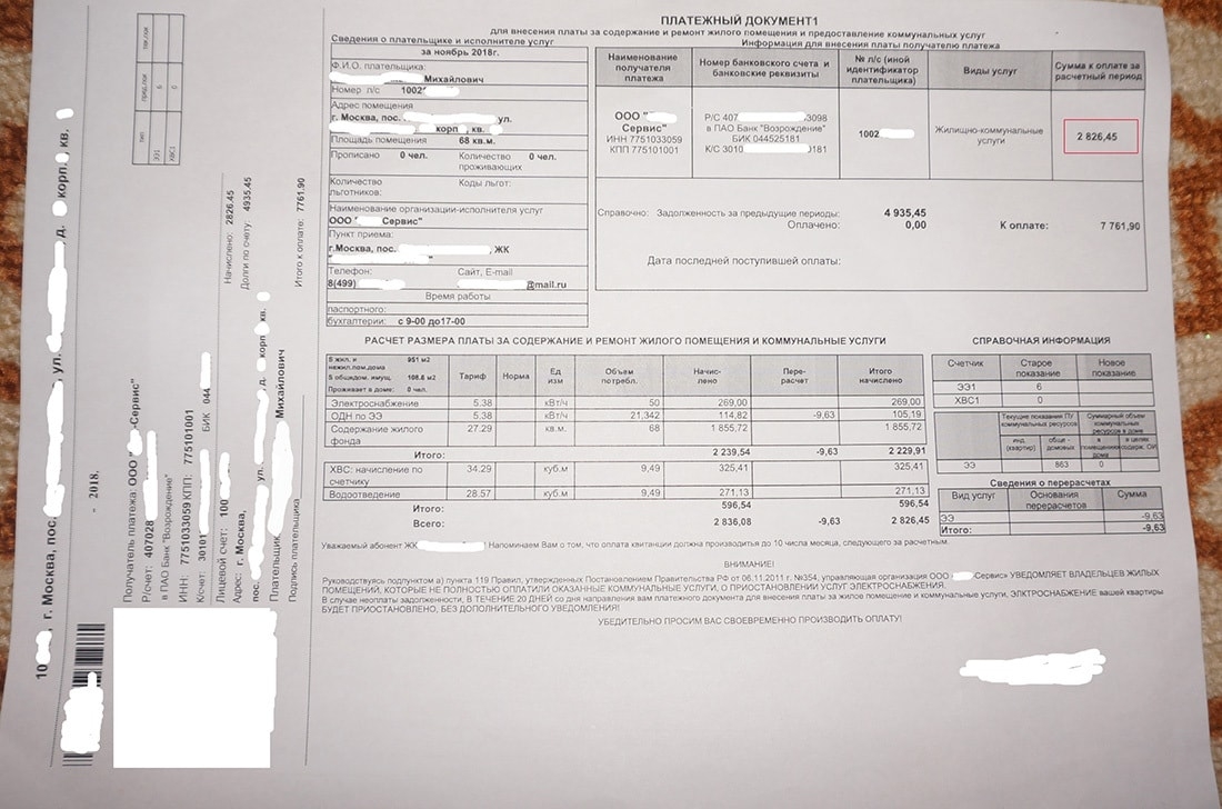 Ремонт мы пока не начали, да и в квартире я появляюсь редко, не до нее пока. Но, согласно постановлению правительства, коммунальные услуги начисляются сразу же, как только жилье переоформляется на собственника. Причем если ты не подаешь показания счетчиков, то сумму накидывают среднюю по нормативам. А так как я действительно «забил» пока на это дело, то у меня образовался долг, в том числе виртуальный за электроэнергию, которой я все это время не пользовался. Впрочем, после беседы с управляющей компанией мне обещали сделать перерасчет — минус 1731, то есть аннулировать долг за электроэнергию, поскольку в реальности киловатты я не мотал и мой счетчик это доказывает. Так что в целом на долг в платежке можно не обращать внимания.