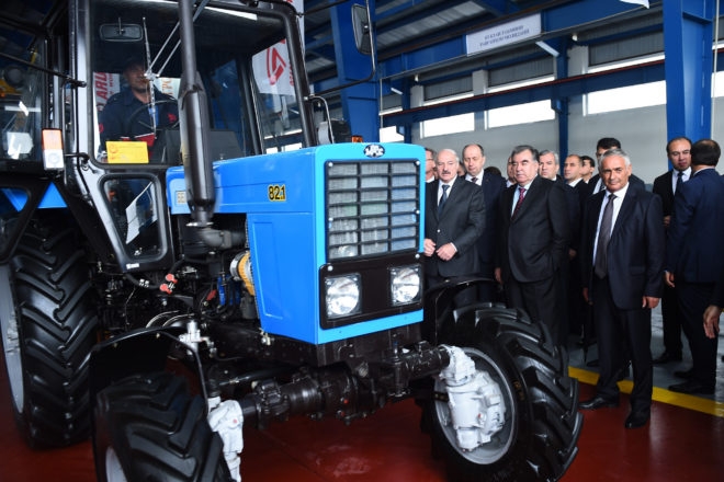 Александр Лукашенко и Эмомали Рахмон официально открыли сборочное производство белорусской сельскохозяйственной техники в городе Гисары в 20 километрах к западу от Душанбе