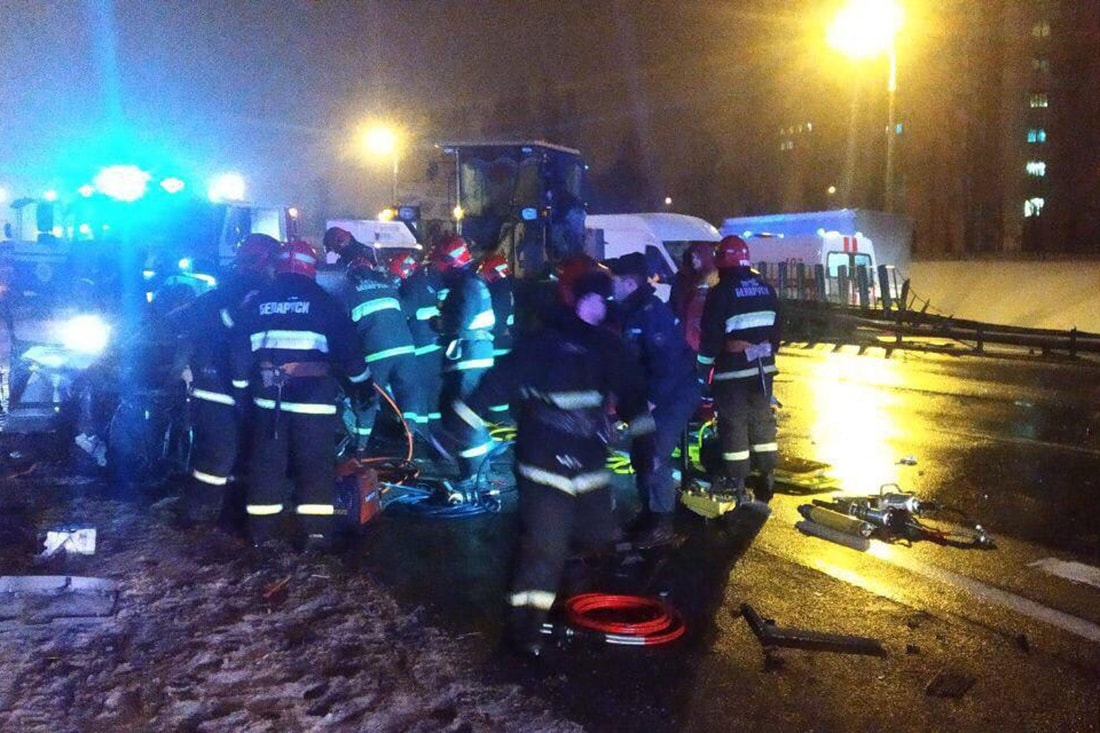 В ГАИ Минска сообщили, что в больницу доставлены четыре человека — это пассажир Mazda, которого деблокировали спасатели, и трое водителей остальных транспортных средств, участвовавших в этой аварии.