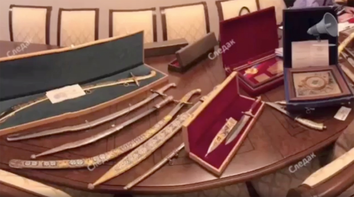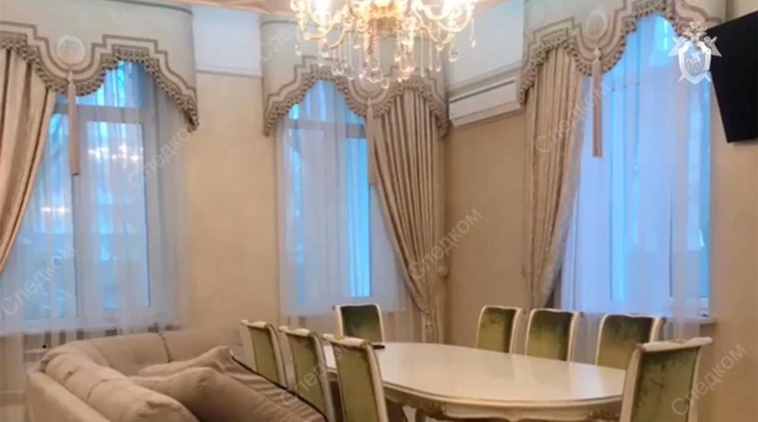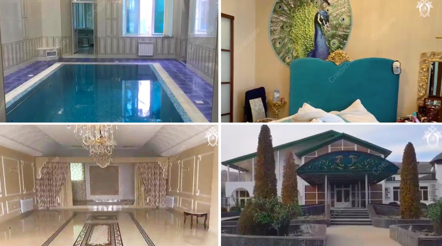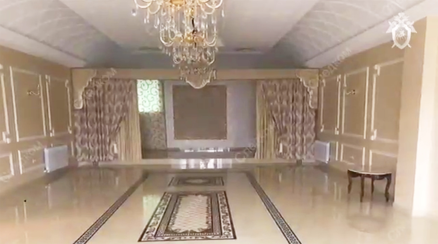 На опубликованных СК кадрах видно резиденцию и её убранство: повсюду позолоченные предметы интерьера, просторные комнаты, резная мебель, большой тренажёрный зал и бассейн. На территории — волейбольная площадка и футбольное поле. Также при обысках в доме у сенатора Рауфа Арашукова, задержанного в среду, нашли холодное оружие, золотые слитки и наличные деньги.