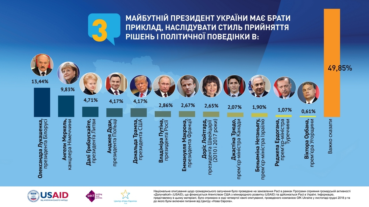 Даже если сложить результаты лишь Меркель и Грибаускайте – в сумме это будет 14,54% – собирательный авторитарный кандидат плавно скатывается с пьедестала. А если добавить к ним голоса Анджея Дуды (4,17%), Эммануэля Макрона (2,67%), Дорис Лойтгард (2,65%) и Джастина Трюдо (2,07%), то ему не помогут и приплюсованные Трамп (4,17%) с Эрдоганом (1,07%) да Путиным (2,86%). Да-да, некоторые украинцы ещё и Путина считают «образцовым политиком», так что Лукашенко здесь не самая дивная фигура.