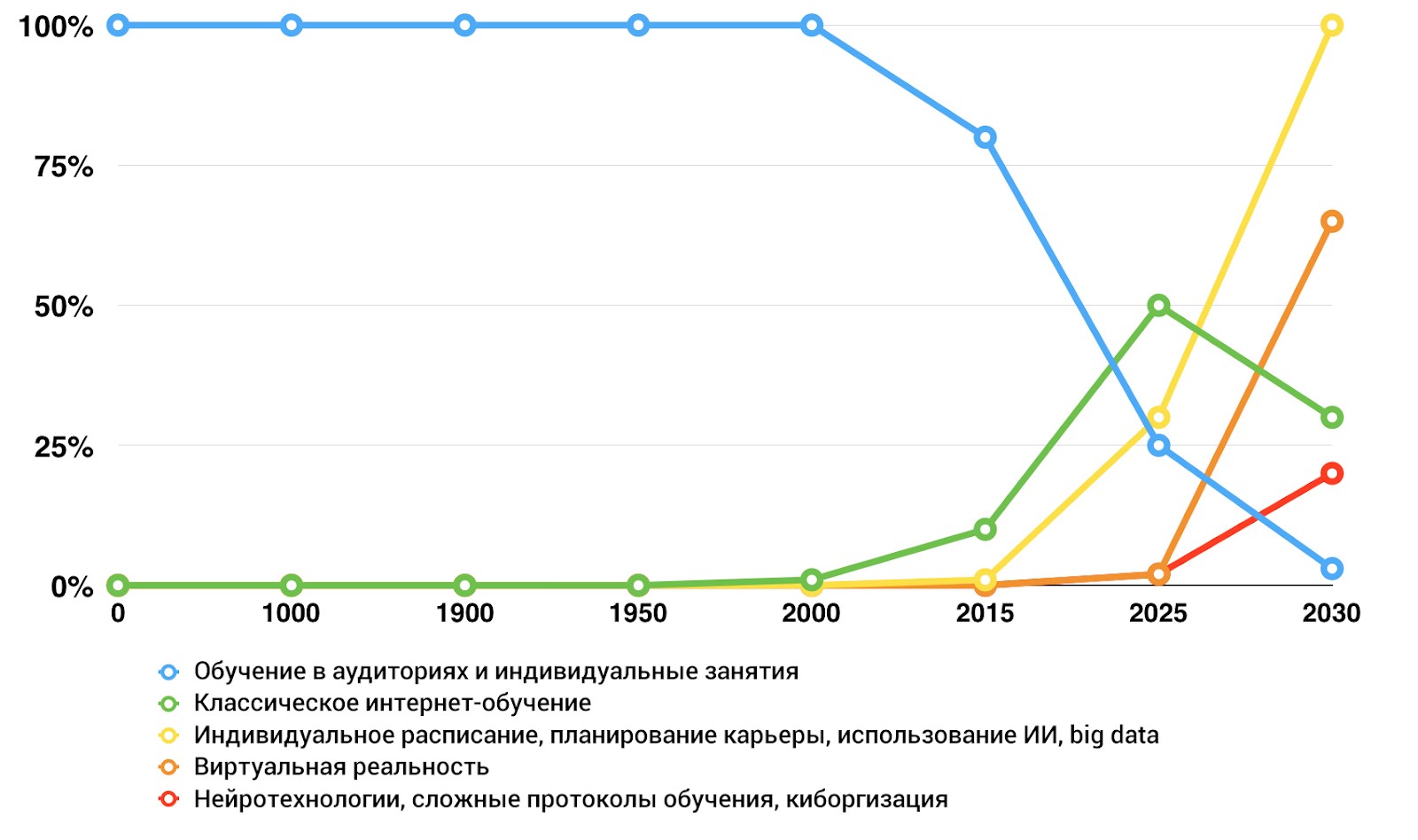 «Образованность» становится важнее «дипломированности». Монополия на знания больше не принадлежит образовательным институтам. Знания толстым слоем размазаны буквально повсюду. Начинают появляться профессиональные сообщества, за счет которых диффузия знаний значительно ускоряется. На этом фоне ценность самих знаний как таковых тоже падает. Им на смену приходит спрос на мышление и спрос на так называемые гибридные навыки (смесь hard и soft компетенций). Образование меняет формат с лекционного на проектное. Ценность прикладного опыта растет. Привычный цикл «узнал − понял − сделал» сменяется на дедуктивный, по принципу «сделал − понял − узнал». Именно такая последовательность запускает сложные процессы мышления.