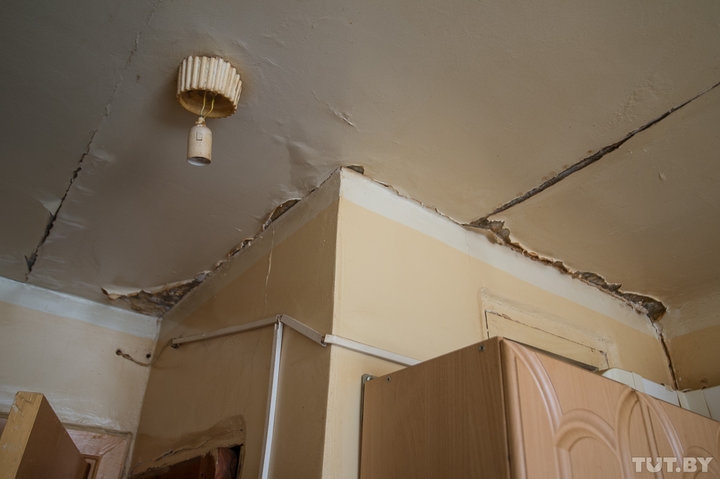 В блоке уже не так страшно, хотя осыпающийся потолок опасение все же вызывает. В углу комнаты, где проходят отопительные трубы, огромное сырое пятно, побелка от стены отстала.