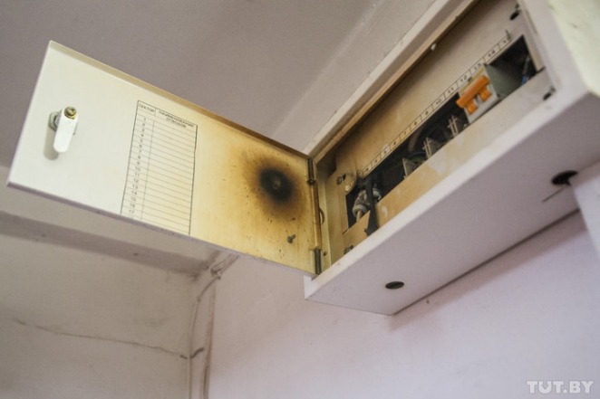 Анжела ведет нас к электрощитку. На дверце черное обгоревшее пятно, да и провода все потемневшее.