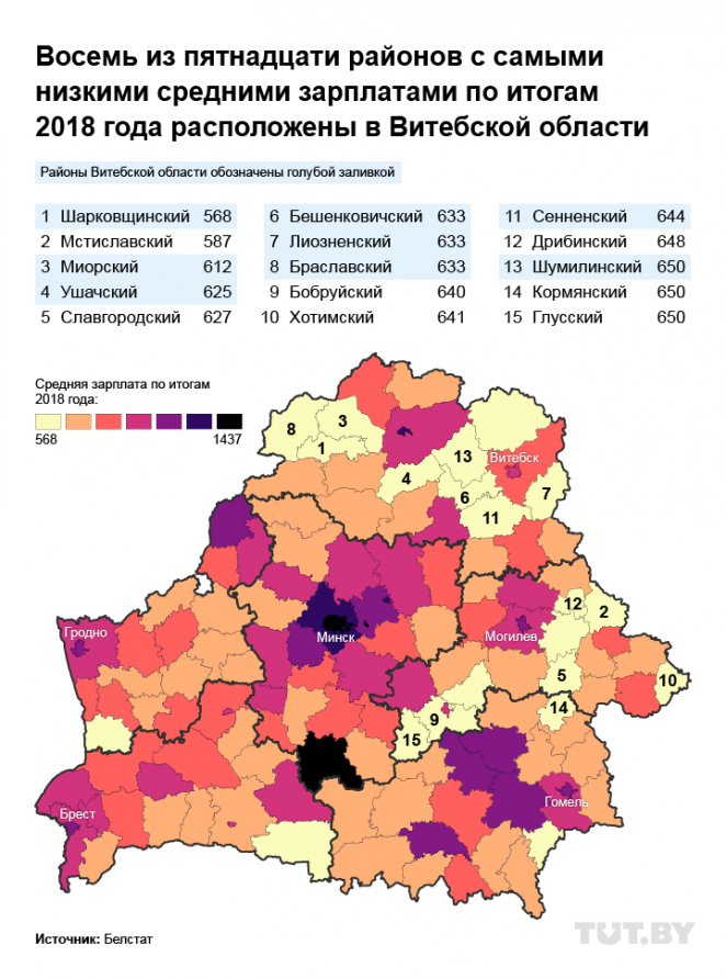 Кто в Беларуси самый бедный или самый богатый, определяет статистика. Правда, все эти «средние подсчеты» уже давно стали грустным анекдотом, в котором начальник ест мясо, подчиненные — капусту, а в среднем они все едят голубцы. Но официальные данные таковы, что постные голубцы — главное блюдо в Витебской и Могилевской областях. Из пятнадцати районов с самыми низкими средними зарплатами по итогам 2018 года восемь — на Витебщине, шесть — на Могилевщине.