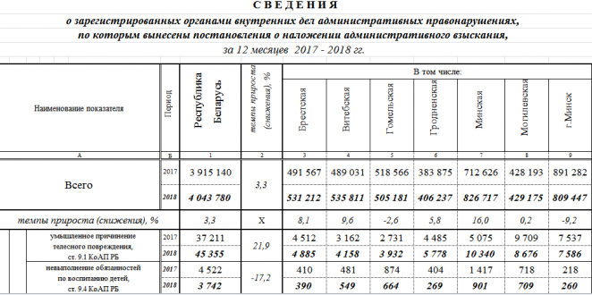 В тоже время на сайте ведомства «висит» для скачивания весьма тревожная статистика по административным правонарушениям. Цифры поражают закононепослушностью белорусов. Судя по всему, в минувшем году мы побили рекорд по нарушениям КоАП, которые были зафиксированы милицейскими протоколами.