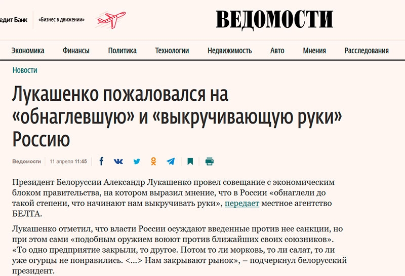 Слова Александра Лукашенко про «обнаглевшую» и «выкручивающую руки» Россию разлетелись по российским СМИ и соцсетям. «Салідарнасць» предлагает краткий обзор публикаций.