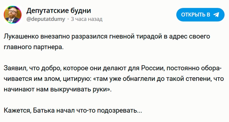 «Беларусь объявила о планах закрыть на ремонт пять участков трубопровода «Дружба», по которому Россия поставляет свою нефть в западные страны. Этот вопрос главный инженер «Гомельтранснефть Дружба» Андрей Вериго поднял после слов президента Беларуси Александра Лукашенко об обнаглевшей Москве и необходимости что-то противопоставить ограничениям на экспорт овощей».