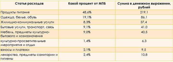 Покупка мебели и предметов культурно-бытового назначения отменяется. 40,5 рубля хватит лишь на завесу от кухонного шкафчика. Кроме того, на эти деньги нужно купить еще и товары хозназначения: стиральный порошок, средство для мытья посуды и так далее. Кстати, Минтруда считает, что из этой суммы человек должен выкраивать какие-то деньги, чтобы раз в 10 лет купить стиральную машину, телевизор и пылесос. В списке предметов, которые нужны человеку, после последнего обновления появился и сотовый телефон. Его мы можем менять раз в 5 лет. Из такого срока службы рассчитан МПБ.