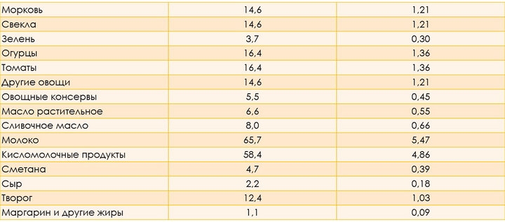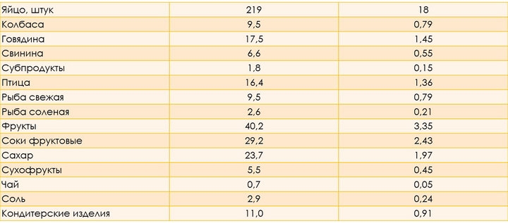 550 граммов свинины, 180 сыра и 2 кило сахара на 30 дней