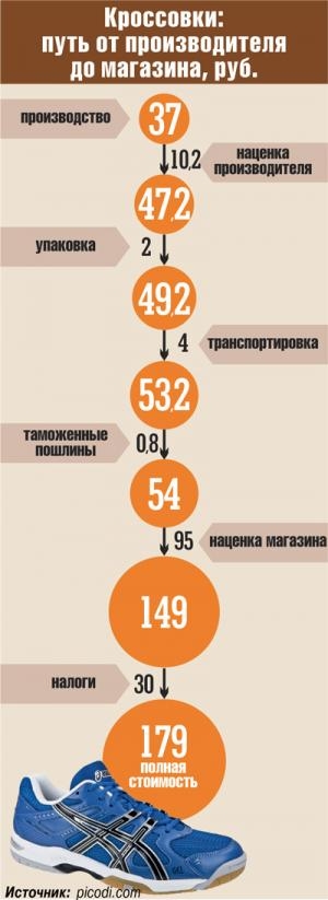 Расходы на производство одной пары составляют около 20% розничной цены, которую покупатели видят на прилавках или в интернет-магазинах. Почему же нам приходится платить в пять раз больше?