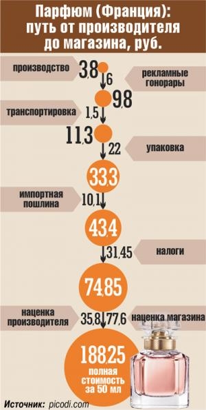К окончательной стоимости стоит прибавить НДС в размере 20%, а также самые большие суммы, которые встретятся нам в этом тексте. Чтобы остаться в плюсе, производитель добавляет свою долю (что от общей суммы составило 19%), а маржа ритейлера может быть разной, но практически всегда превышает 40%. По расчетам Picodi.com, из 188,25 рубля, отданных за качественный парфюм довольно известной марки, почти 36 забирает французская фабрика, а 77,60 (а это более 49%) – белорусский магазин.