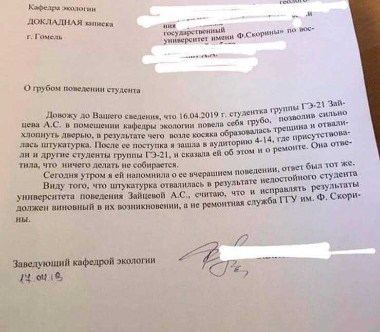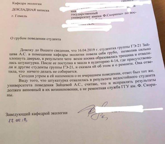 Об инциденте сообщили в Telegram-канале «Отчислено». Согласно докладной, в минувший вторник «студентка в помещении кафедры экологии повела себя грубо, позволив сильно хлопнуть дверью, в результате чего возле косяка образовалась трещина и отвалилась штукатурка».