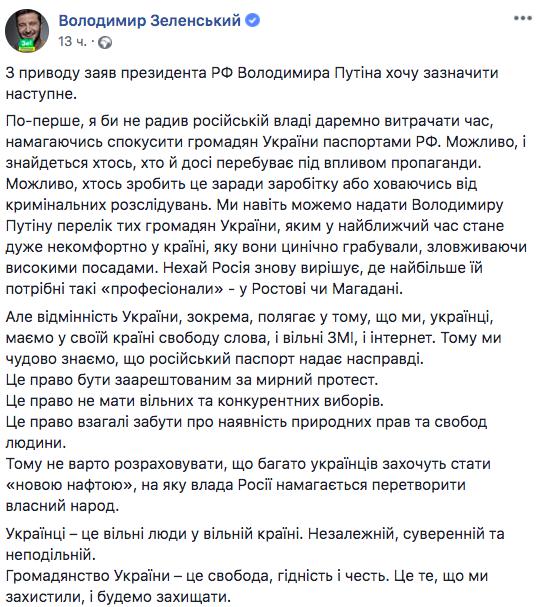 27 апреля Владимир Путин пригрозил упростить предоставление гражданства РФ жителям не только "Л/ДНР", но и всей Украины. Ему на это жестко ответил новоизбранный президент Украины Владимир Зеленский.