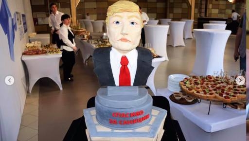 «Нам пять лет мешают жить. Нам пять лет мешают работать. Нам закрывают въезд многие страны. Поэтому мы решили ответить. Сегодня крымская «кремлевская пропаганда» официально съест Трампа и все санкции»,— сказал перед разрезанием торта журналист Олег Крючков и вонзил ножик в бисквитного Трампа. Крючков работает толи на НТВ, толи идеологом на местном ТРК КРЫМ, но замечен и там, и там.