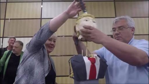 Итак, крымскому телевидению на днях исполнилось 60 лет. Телерадиокомпания Крым, телерупор местного Совмина и пропаганды, решило немного гульнуть по случаю юбилея. Всё бы ничего, да и дата серьёзная, но вот вылезла крайне непотребная история. На вечеринке подвеселевший народ банально резал и жрал Трампа под дружное улюлюканье собравшихся.