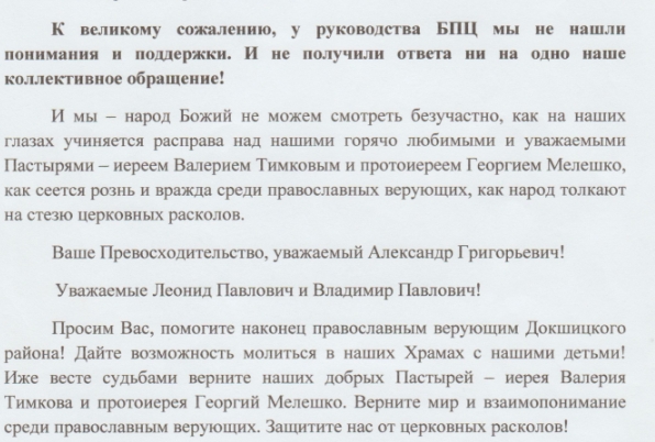 Интересно, что в обращении к главе государства верующие пишут, что лжесвидетельства против Валерия Тимкова якобы пытаются получить от «представителей БНФ» – так члены приходского совета называют некоторых жителей Бегомля, что открыто выступают против Лукашенко. Действительно ли эти люди имеют отношение к Партии БНФ или КХП-БНФ, или верующие просто ретранслируют распространенный стереотип – выяснить не удалось.