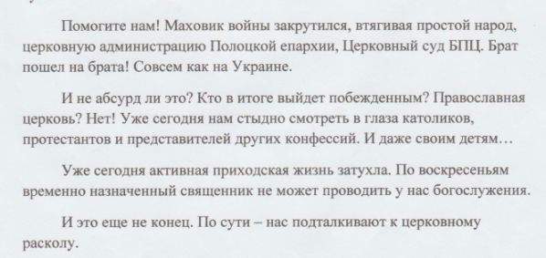«Помогите нам! Маховик войны закрутился, втягивая простой народ, церковную администрацию Полоцкой епархии, церковный суд БПЦ. Брат пошел на брата. Совсем как в Украине», – отмечается в обращении к Кириллу.