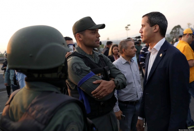 Лидер оппозиции Хуан Гуайдо ведет переговоры с военными 30 апреля 2019 года. Фото: Reuters