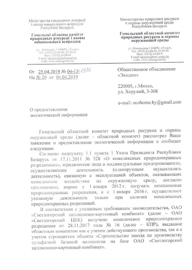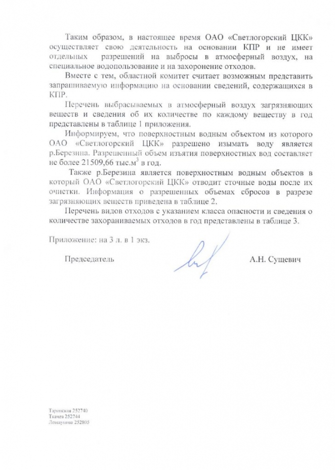 «ОАО «Светлогорский целлюлозно-картонный комбинат получено комплексное природоохранное разрешение от 28.11.2017 года №16, выданное областным комитетом как с учетом действующего производства, так и с учетом строящегося объекта «Строительство завода по производству сульфатной беленой целлюлозы… В настоящее время Светлогорский ЦКК осуществляет свою деятельность на основании КПР и не имеет отдельных разрешений на выбросы в атмосферный воздух, на специальное водопользование и захоронение отходов». Такой ответ дал председатель Гомельского областного комитета природных ресурсов и охраны окружающей среды А.Сущевич на запрос «Экодома».