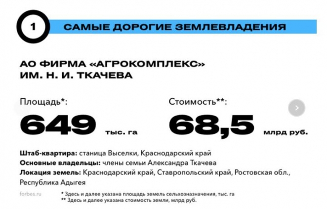 Ежегодный рейтинг «Форбс» называется «Хозяева земли русской: 20 самых дорогих землевладений России». Из него следует, что 20 землевладельцам принадлежит 7,9 млн га стоимостью 471,6 млрд российских рублей, или 7,3 млрд долларов. Самая дорогая земля — у компании «Агрокомплекс» им. Н. И. Ткачева, во главе которой стоит экс-губернатор Краснодарского края и экс-министр сельского хозяйства Александр Ткачев. Он рулил российским сельским хозяйством с апреля 2015-го по май 2018 года, а сейчас владеет землей общей стоимостью 68,5 млрд российских рублей, или чуть более миллиарда долларов.