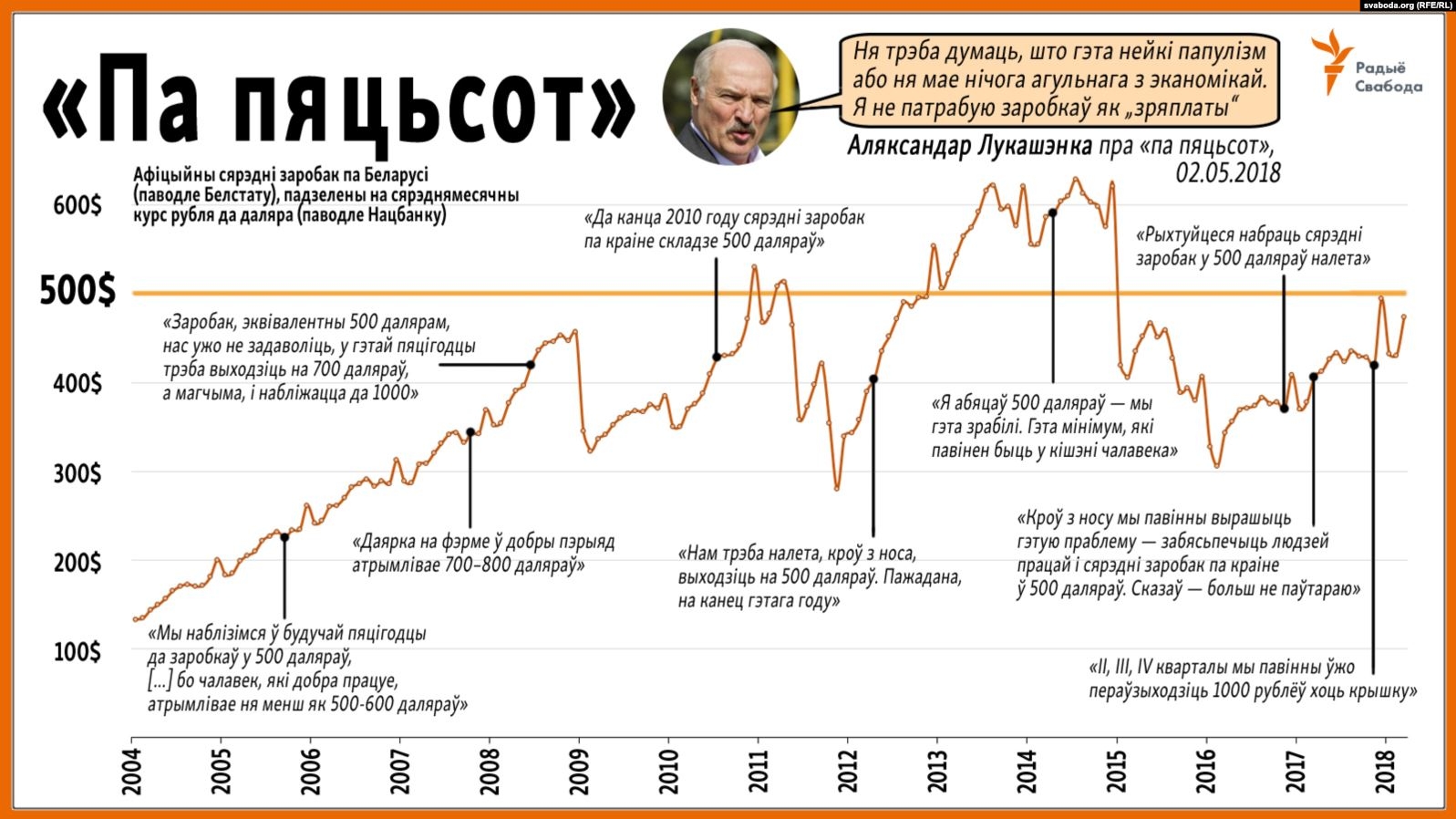 Особенно примечателен был 2010 год. С января до декабря того года средняя зарплата в стране выросла с 350 до 530 долларов, то есть на 51%. Результатом искусственного раздувания этого пузыря стал масштабный финансовый кризис в 2011 году. Тогда белорусский рубль девальвировался почти в три раза, началась гиперинфляция, средняя зарплата в валютном выражении упал вдвое, валюта исчезла из свободной продажи, появились очереди в обменниках, люди массово скупали в магазинах соль и спички.