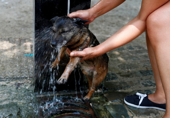 Хозяйка пса охлаждает его струей фонтана. Брюссель, Бельгия, 24 июня 2019 года. Фото: Reuters