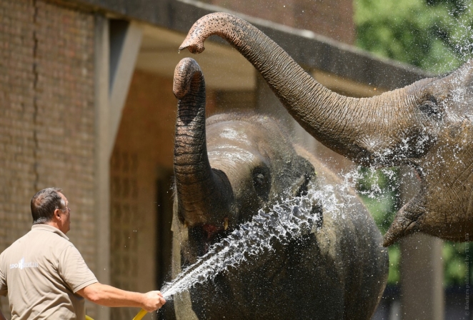 От жары страдают не только люди, но и звери. В зоопарке Берлина слонов охлаждают при помощи холодного душа. Берлин, Германия, 25 июня 2019 года. Фото: Reuters