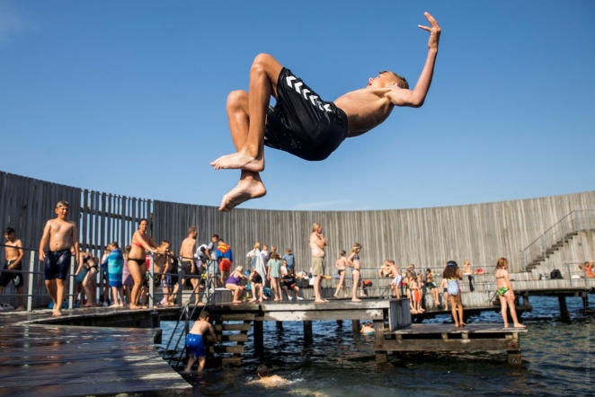 Мальчик прыгает в воду на острове Амагер. Копенгаген, Дания, 25 июня 2019 года. Фото: Reuters