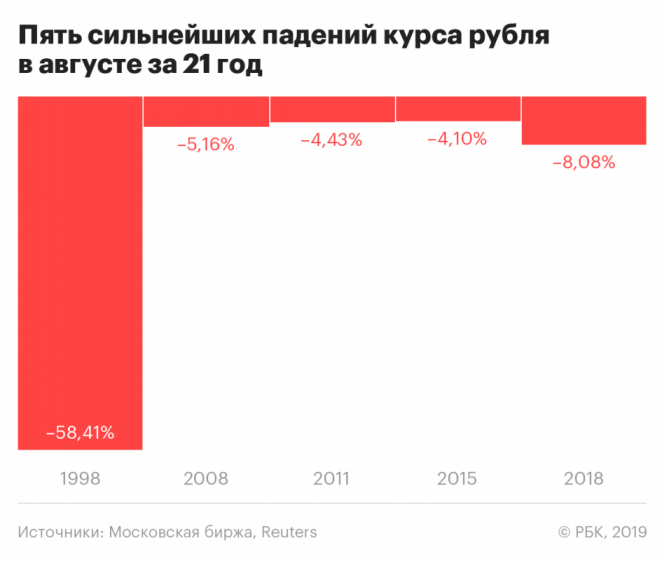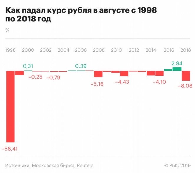 За последние 20 лет курс доллара регулярно взлетал именно в августе. Пара исключений только подтверждает правило: восьмой месяц года — один из худших для рубля эпохи Путина и Ельцина. Самое сильное падение было зафиксировано в августе 1998 года. Тогда курс рубля обвалился на 58% за месяц.