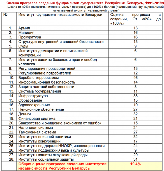 Средний показатель по всем 28 параметрам независимости – 19,4% из 100%. После 28 лет политический, правовой, экономический и социальный проект «Республика Беларусь» всё ещё находится на начальной стадии реализации. За всё это время мы, как страна, не прошли и пятой части пути.