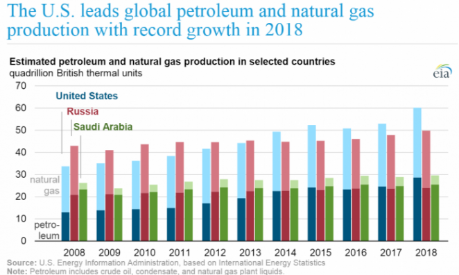 А вот надо ли торопиться Минску? Из Северной Америки приходят весьма впечатляющие новости. Global Witness в своем докладе убедительно показывает, что в 20-е годы США «утопят мир в нефти». По прогнозу, в ближайшие 10 лет на долю США придется 61% всей мировой добычи нефти и газа на новых проектах. США уже являются крупнейшим мировым производителем углеводородов. В 2018 году добыча нефти в США выросла на 16%, а газа на 12%. Соединенные Штаты обошли Россию по добыче газа еще в 2011 году, а прошлый год ознаменовался тем, что позади остался мировой производитель нефти - Саудовская Аравия.