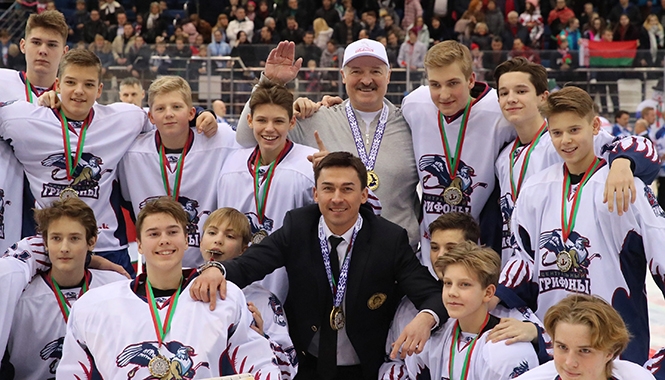 В центре Александр Лукашенко с младшим сыном Николаем, а также генеральный директор минского «Динамо» Дмитрий Басков. Фото: president.gov.by