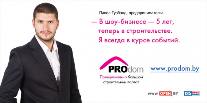 В 2007-м в Минске можно было видеть билборды с изображением молодого человека. Как писала тогда «Салiдарнасць», бизнесмен и солист группы «Арбат» Павел Гузбанд — в рекламе строительного портала.