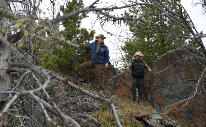 Уверен, что Президент и Министр обороны были там не вдвоём, а как всегда с кучей сотрудников и сотрудниц ФСО, которые прятались за ёлками, камнями и возможно грибами.