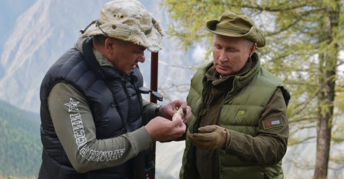 Владимир Путин передает Сергею Шойгу найденный гриб. Пока что не президентский пост. День рождения президента РФ в сибирской тайге 7 октября 2019 года / ТАСС