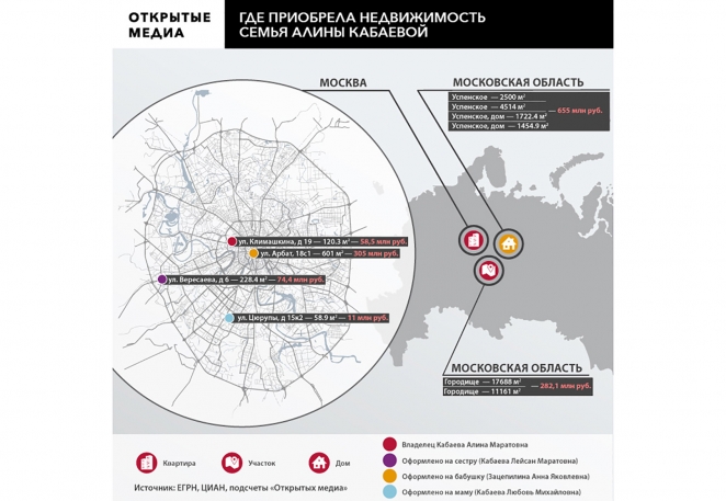С учётом объектов, о которых СМИ писали раньше, на Кабаеву и её родных оформлены шесть квартир в Москве и Санкт-Петербурге, два дома и 70 соток земли; суммарная рыночная стоимость, как подсчитали «Открытые медиа», сейчас может составлять около 1,25 млрд рублей (при оценке не учитывалась цена уже проданной земли в Городище). В большинстве случаев речь идёт о недвижимости в закрытых населённых пунктах, а предыдущие владельцы имеют отношение к «Газпрому»: это либо влиятельные предприниматели, прямо или через своих основных партнёров по бизнесу связанные с газовым монополистом, либо структуры самой госкомпании.