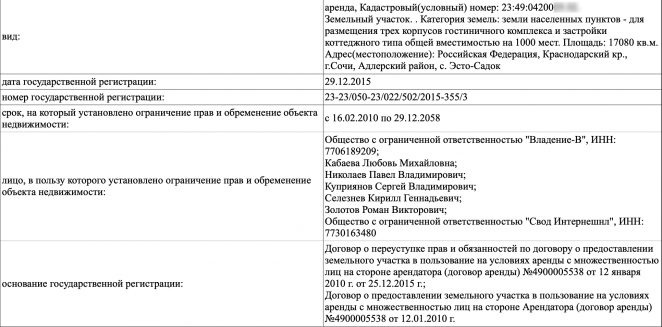 Кабаевой и остальным эта недвижимость обходится дешевле: меньше 300 рублей в день на всех, выяснили «Открытые медиа», изучив материалы арбитража. Предметом разбирательства стала арендная плата: сочинские чиновники решили поднять тариф, и арендаторы — Кабаева, Золотов, Куприянов и остальные — не согласились с этим решением и обратились в суд в 2019 году. В ходе слушаний стало известно, что участок обходится в 101,5 тысячи рублей в год, а местные власти хотели повысить плату более чем в 20 раз, ориентируясь на рыночную стоимость объектов. Суд встал на сторону арендаторов, решение было утверждено 1 октября 2019 года в кассации суда Северо-Кавказского округа. Интересы Любови Кабаевой в этом процессе защищал юрист Потемкин М. Д., выступавший в судах от имени «Газпрома».