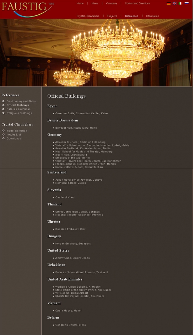 Компания была основана в 1960 году и является одним из крупнейших производителей хрустальных люстр в мире. Для производства закупается хрусталь у компании Swarovski AG. Одним из главных достоинств люстр Faustig является превосходное сочетание хрусталя и гальваническое покрытия с использованием 24-каратного золота и серебра.
