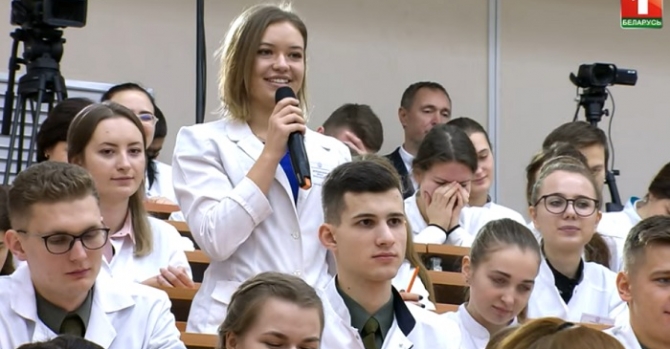 БГМУ глава государства посетил в пятницу тринадцатого. Канал «Беларусь 1» показал более чем часовую телеверсию общения Лукашенко со студентами. В конце встречи с вопросом к главе государства обратилась пятикурсница Инна Дубовская.