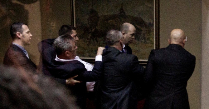 В ходе голосования по законопроекту кто-то бросил в центр зала баллончик со слезоточивым газом. Кроме того, оппозиционные депутаты разбили один из аппаратов для голосования.