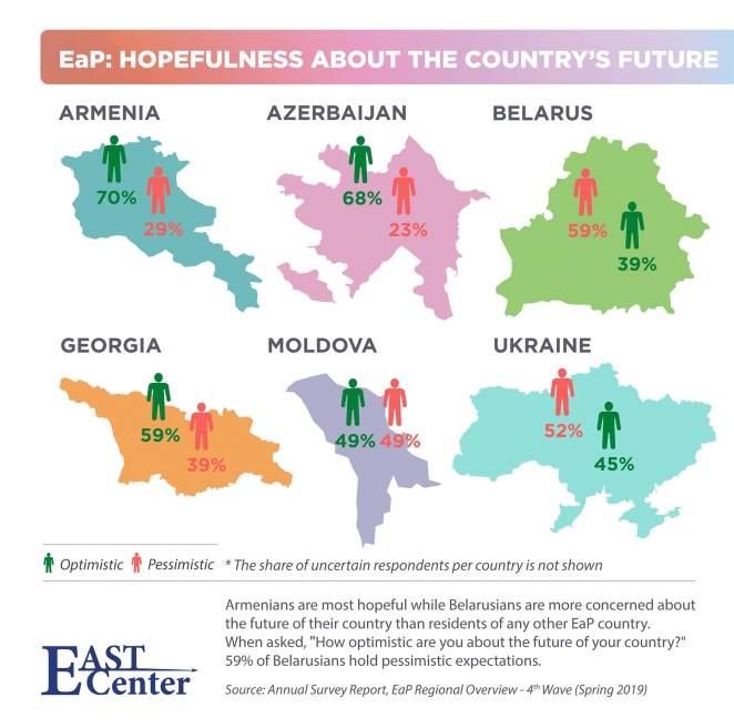 – Среди жителей какой из шести стран Восточного партнерства самый большой уровень пессимизма по поводу будущего их страны? – написал директор по исследованиям центра Андрей Елисеев. – Может быть, среди жителей Армении или Азербайджана, которые никак не могут разрешить конфликт из-за Нагорного Карабаха? Или среди украинцев, учитывая войну на Донбассе?