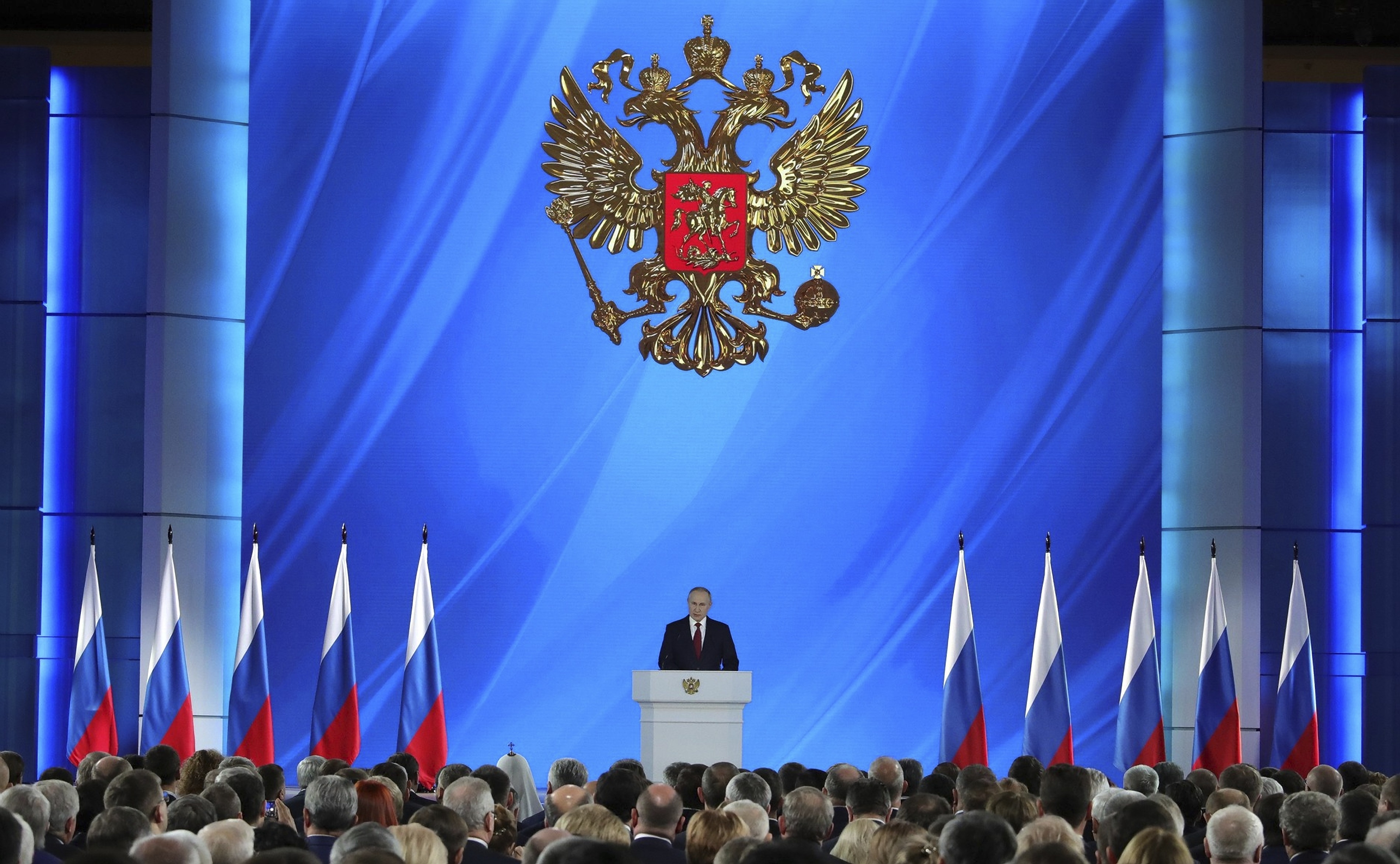 Владимир Путин выступает с посланием Федеральному Собранию. Во время выступления президент РФ ни разу не упомянул Беларусь. Фото Mikhail Klimentyev/Kremlin Pool / Zuma Press / Forum