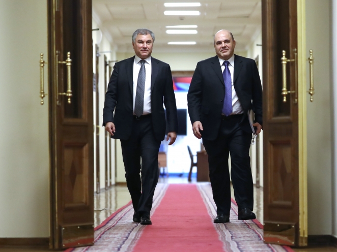 Председатель Государственной Думы РФ Вячеслав Володин и новый премьер-министр России Михаил Мишустин. Фото Anton Novoderezhkin/TASS