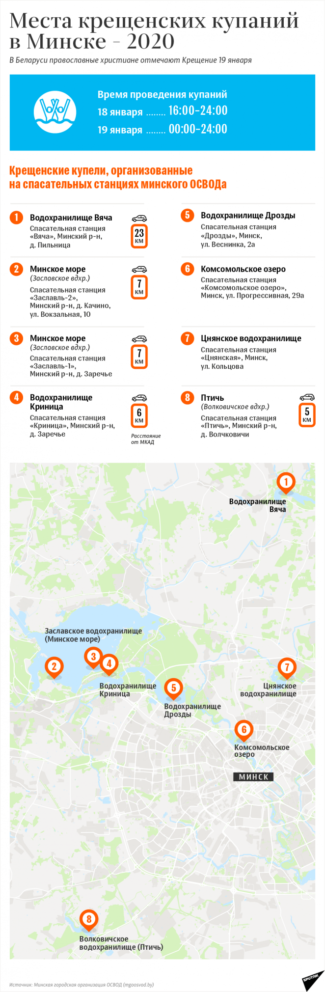 18–19 января минский ОСВОД традиционно организует крещенские купели у спасательных станций. В этом году восемь оборудованных организацией мест для купания будут принимать посетителей с 16:00 18 января до 24:00 19 января без перерыва. Купания в других местах строго запрещены.