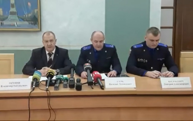 Тихиня (слева) на пресс-конференции, посвященной делу об убийстве бизнесмена из Березино, май 2019 года. Скриншот с видео СК