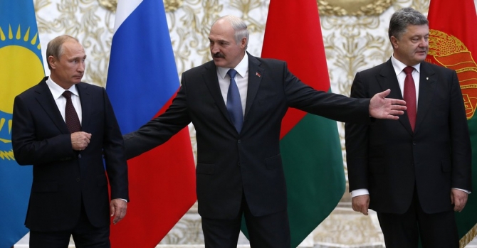 Беларусь. Минск. 26 августа 2014. Президент России Владимир Путин, президент Беларуси Александр Лукашенко, президент Украины Петр Порошенко во время церемонии фотографирования на встрече в формате Таможенный союз — Украина — Евросоюз. Фото: Reuters