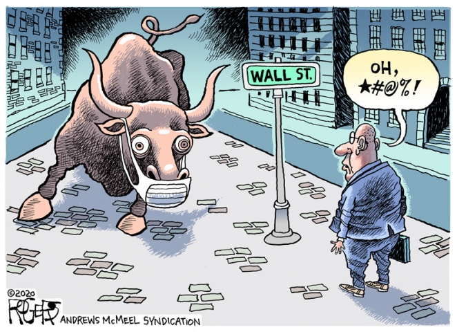 Самое ужасное началось в конце недели, когда мировые фондовые биржи столкнулись с крупнейшим за девять лет обвалом. Индексы, отражающие котировки акций по всему миру, рухнули за один день на десять процентов, что означает суммарное снижение стоимости активов на пять триллионов долларов. Это сопоставимо с ВВП Японии. Основной американский фондовый индекс S&P500 за прошедшую неделю упал на 12% - такого не было со времен Великой депрессии. Как следствие изображение больного гриппом быка (символ Уолл-стрит) стала чуть ли не топовым среди карикатуристов. Как пример, изображение Роба Роджера (США).