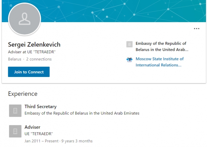 Однако и это еще не все. В интернете можно найти раздел Зеленкевича на Linkedin. Там помимо работы в посольстве в ОАЭ указана еще одна должность – советник в УП «Тетраэдр».